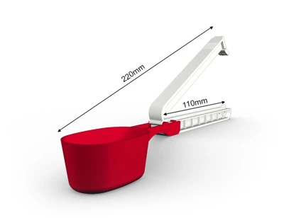 WeLoc Scoop is part of our range where, in addition to a clever WeLoc closure, a measuring scoop (or spoon) is also included. The clip with scoop attached is available in various length/size combinations to suit most needs. Our smaller scoops are perfect for packs of coffee, protein powder, bags of dry goods in the kitchen and laundry detergents. The larger versions can help you measure out the right amount of different pet foods such as dog and cat biscuits, while also ensuring your packages are properly sealed to preserve flavour/aroma and extend shelf life.